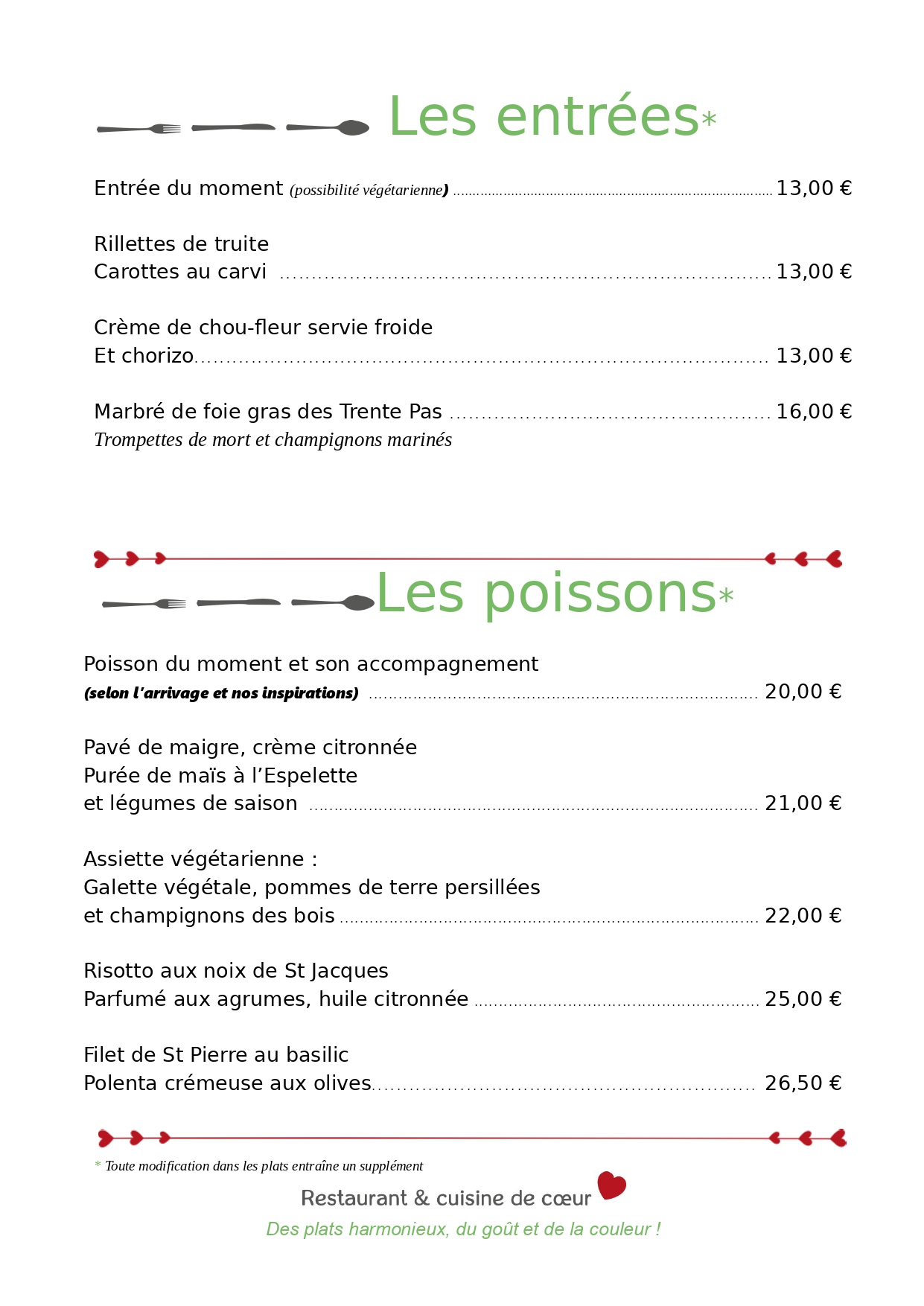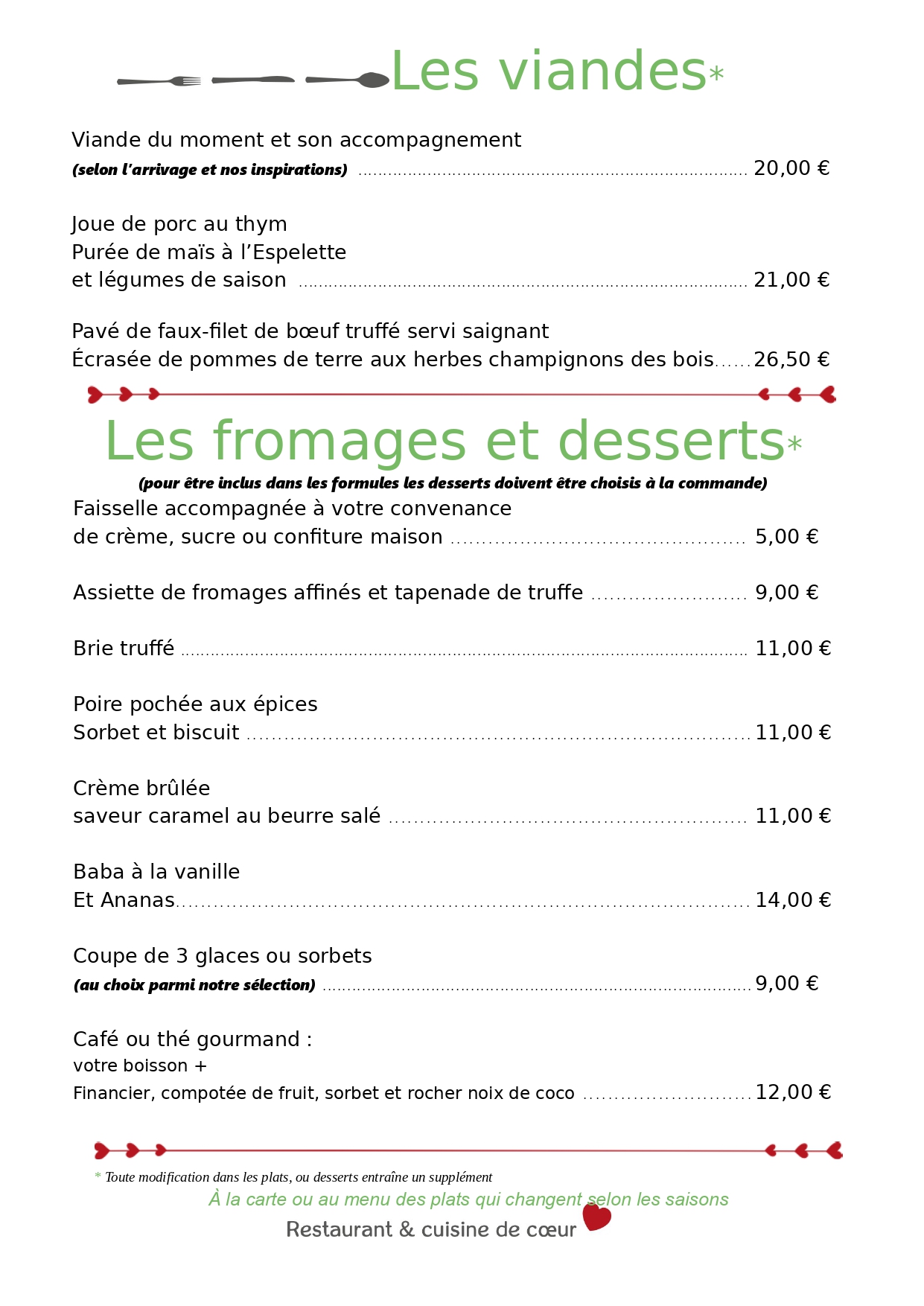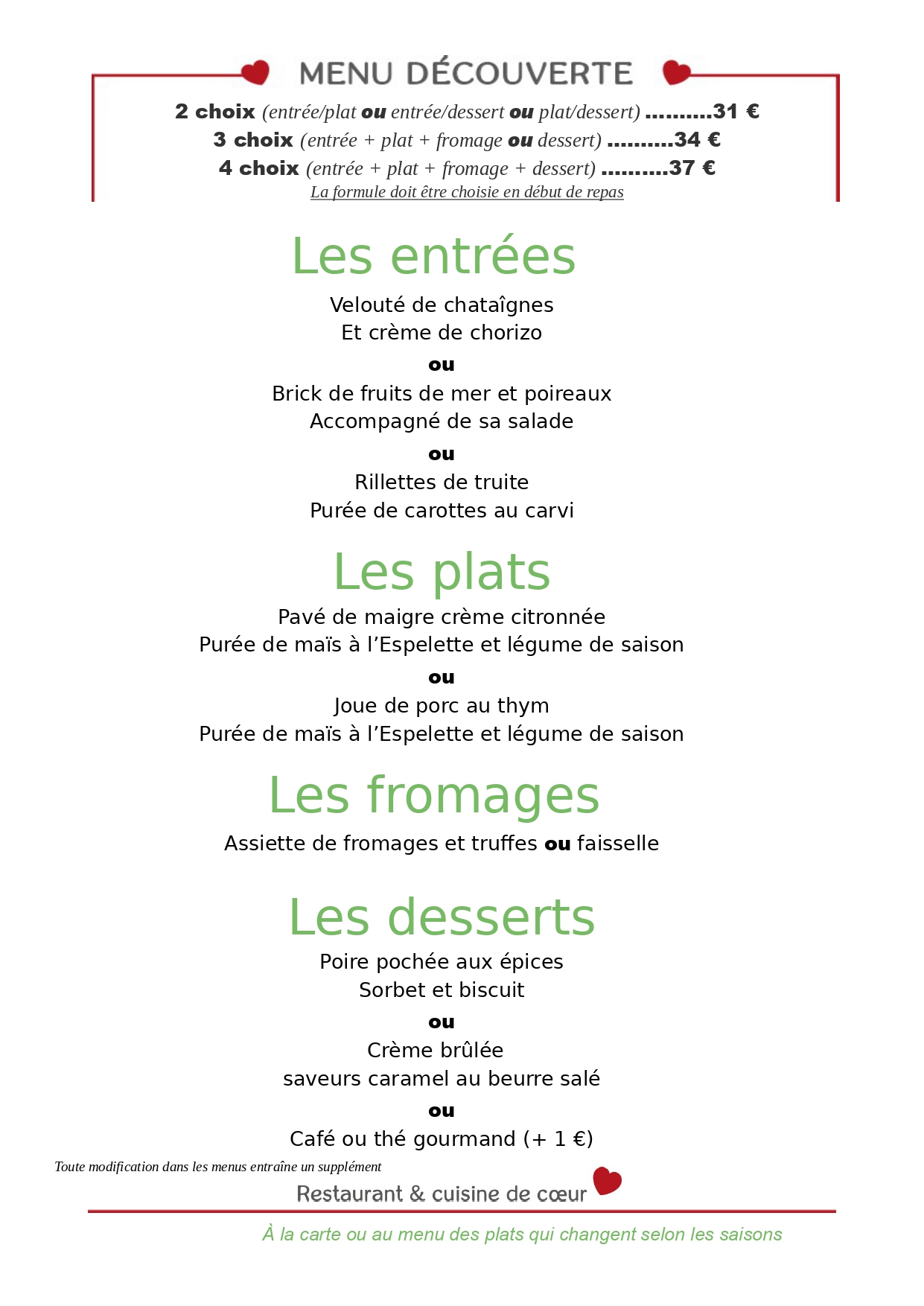 Nous, Marie-Laurence et Fabrice, avons à cœur de vous proposer, de l’entrée au dessert, en menu ou à la carte, des plats tous réalisés sur place à partir de produits bruts, pour une cuisine traditionnelle, revisitée, avec une pointe d’originalité.