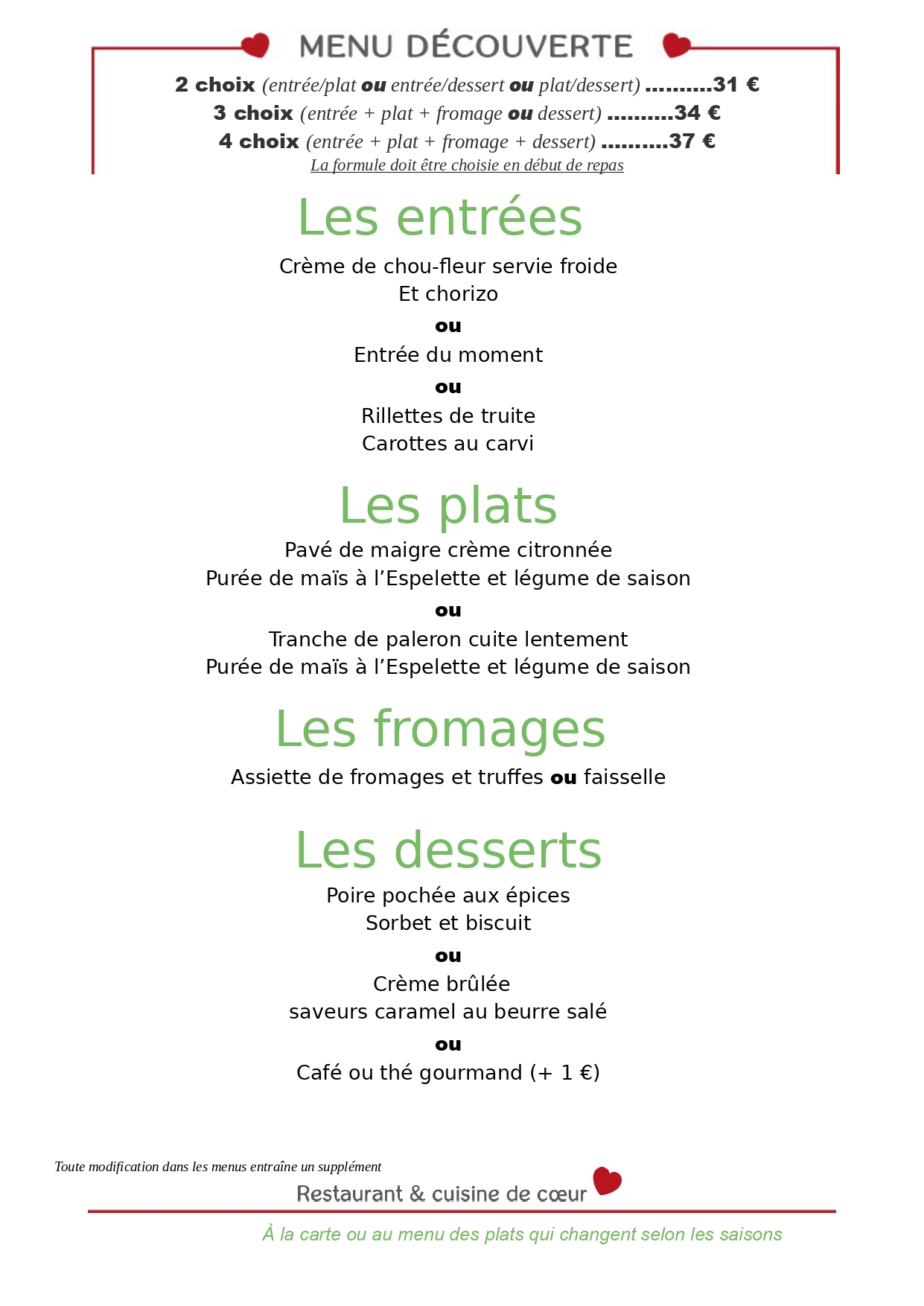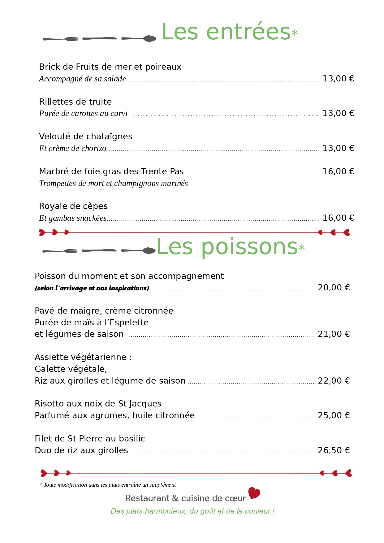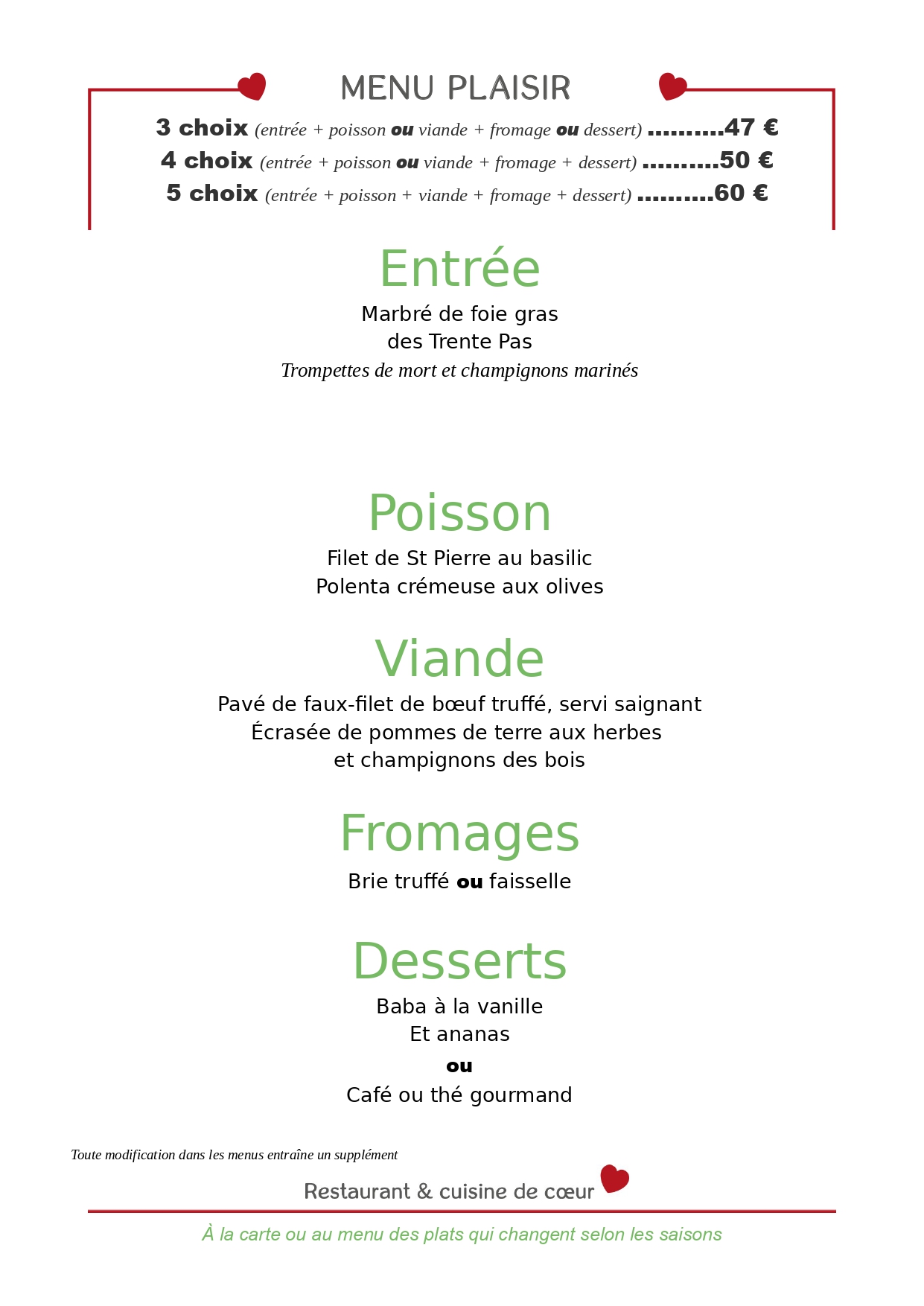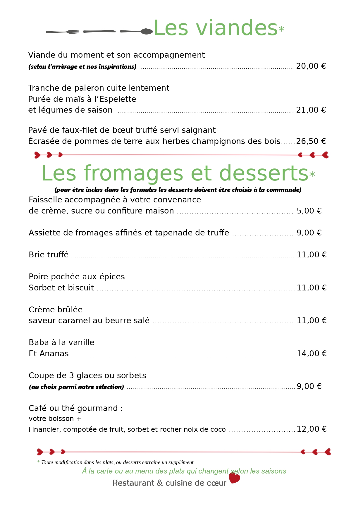 Nous, Marie-Laurence et Fabrice, avons à cœur de vous proposer, de l’entrée au dessert, en menu ou à la carte, des plats tous réalisés sur place à partir de produits bruts, pour une cuisine traditionnelle, revisitée, avec une pointe d’originalité.